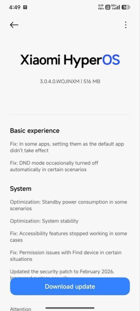 This HyperOS 3 update also includes the February 2026 Android security patch. Security patches often don’t bring visible changes, but they are essential for keeping the phone secure. From this perspective, this update is not something to ignore.